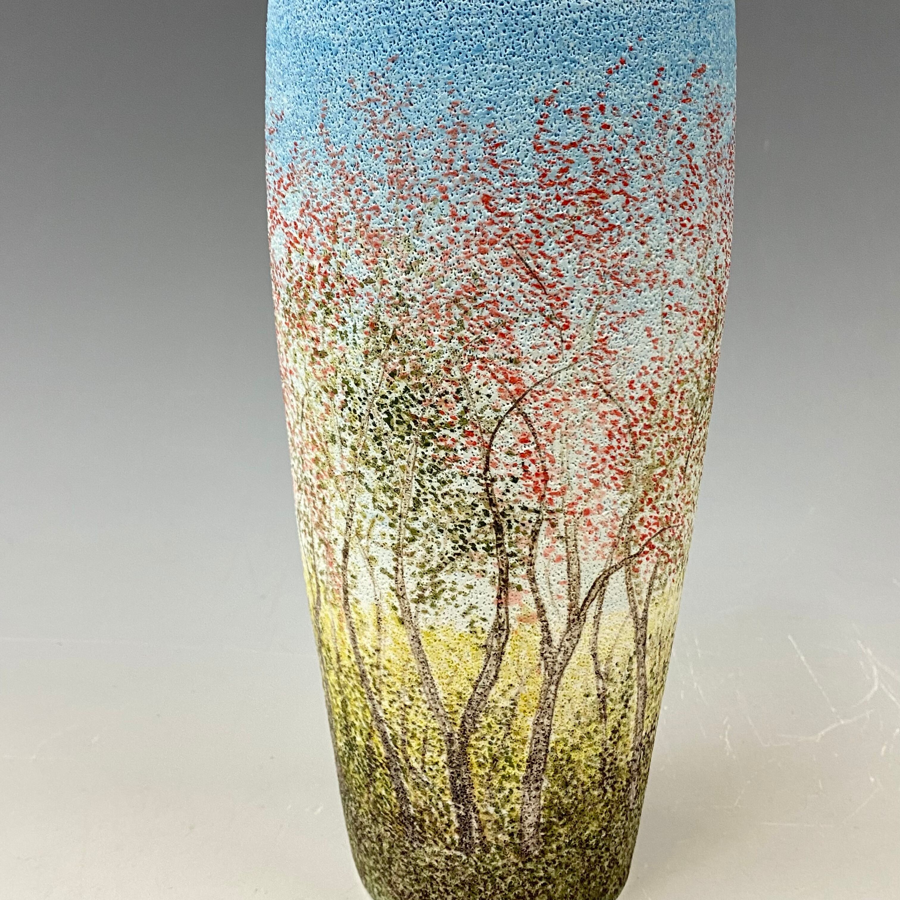 ろくろ成形後、磁肌がまだ柔らかいうちに、木綿針を使って表面に点刻を施し、細い筆を使って顔料を差し込み、奥行きを出す為に何度も彩色を重ね、緻密な手作業で作られた作品です。