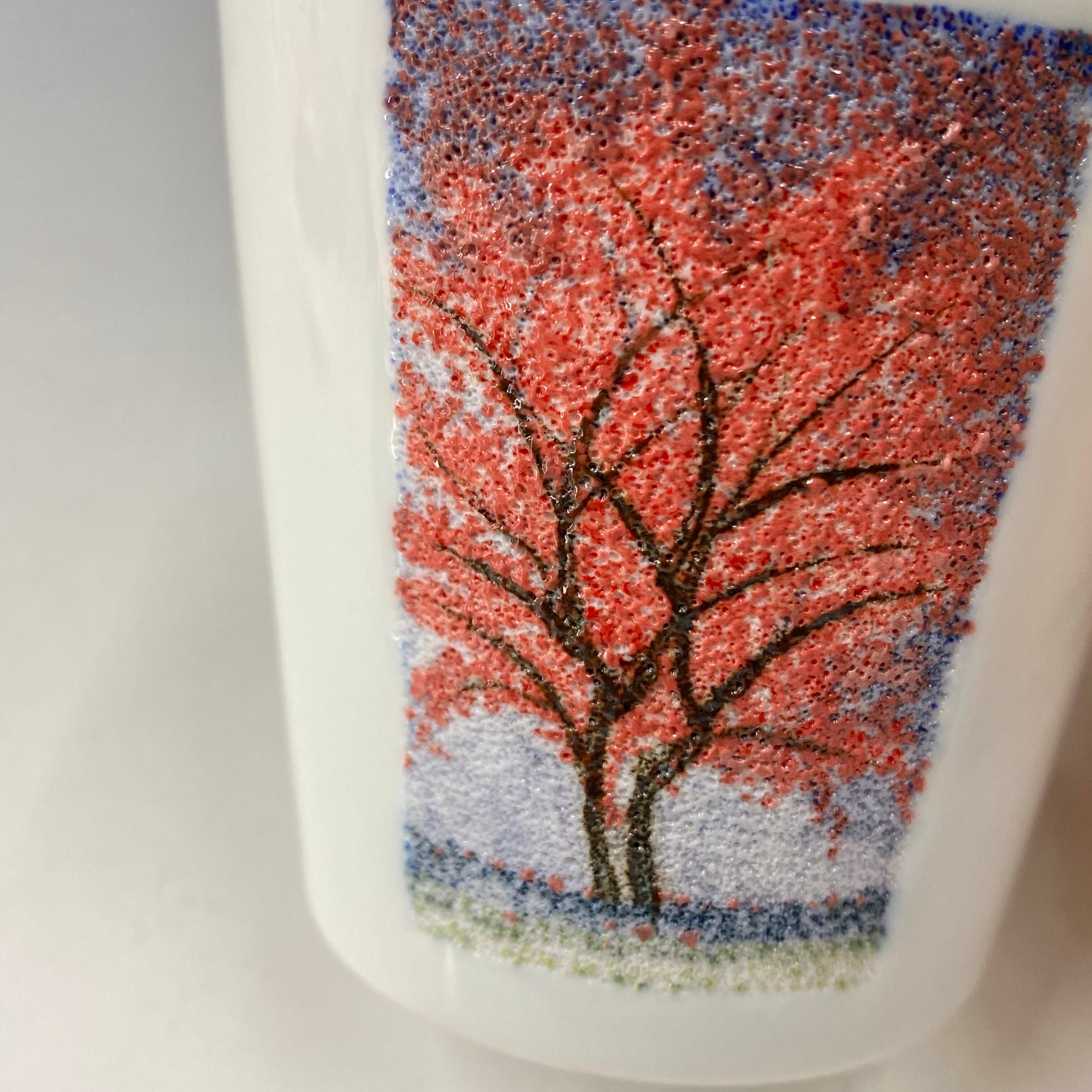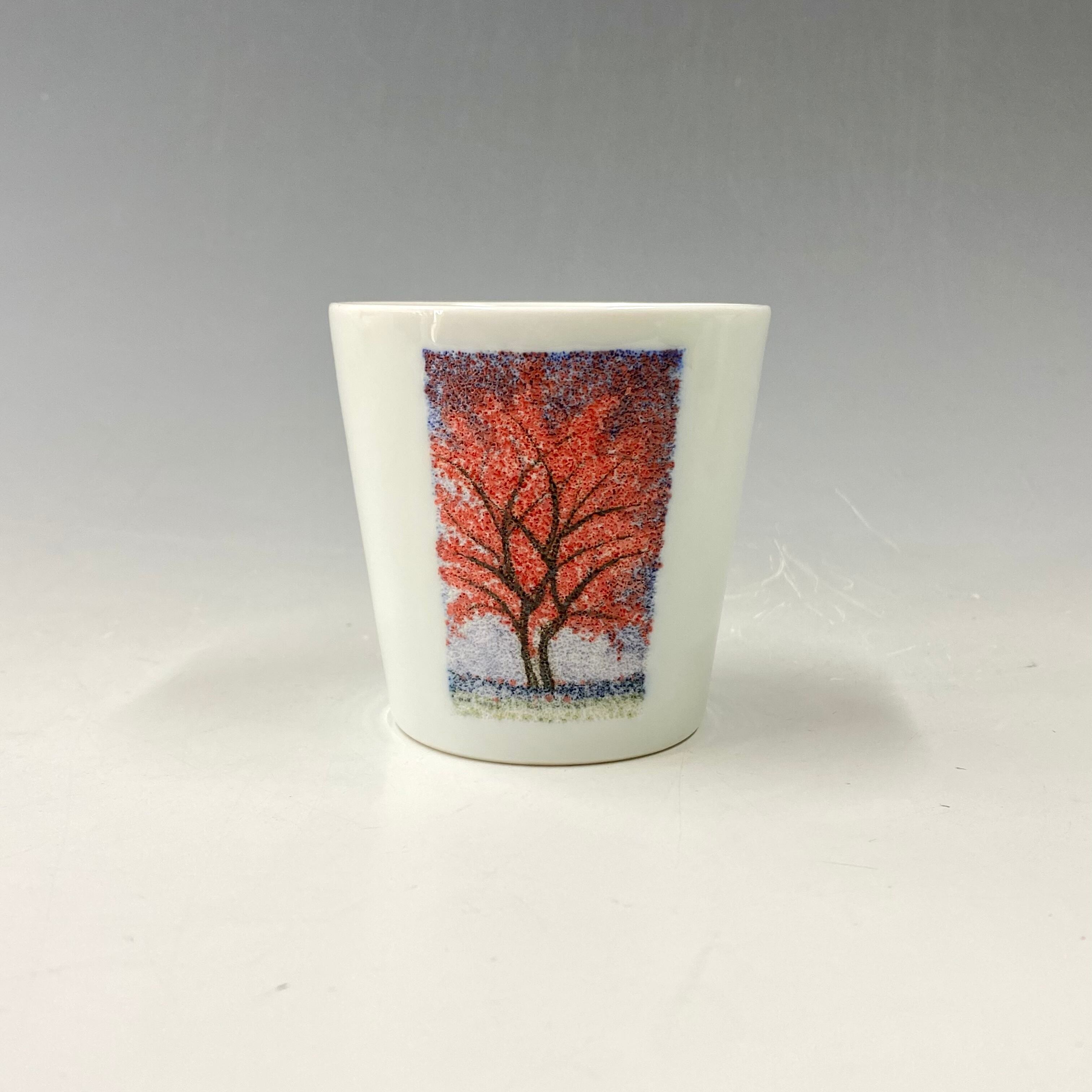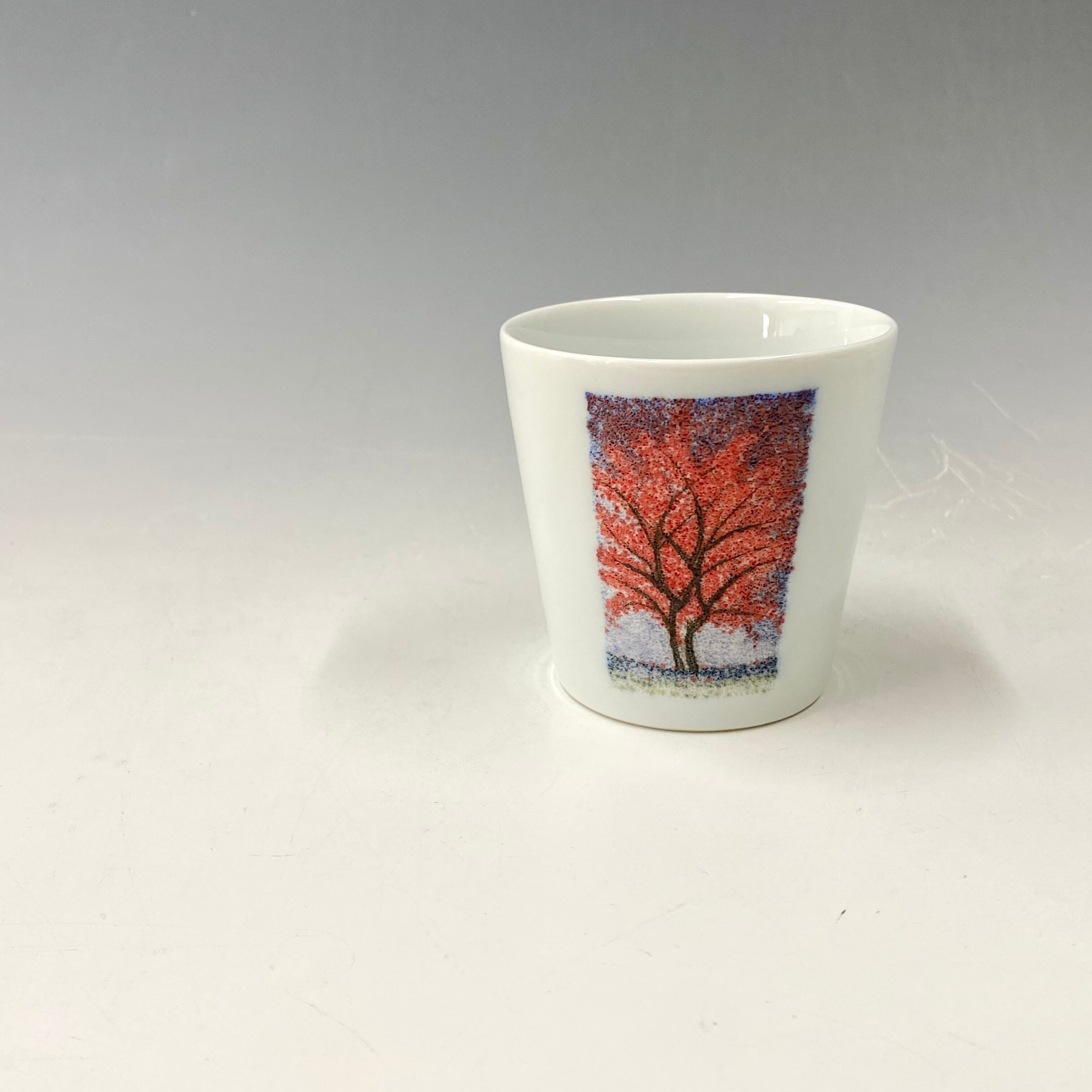 ろくろ成形後、磁肌がまだ柔らかいうちに、木綿針を使って表面に点刻を施し、細い筆を使って顔料を差し込み、奥行きを出す為に何度も彩色を重ねたフリーカップです。