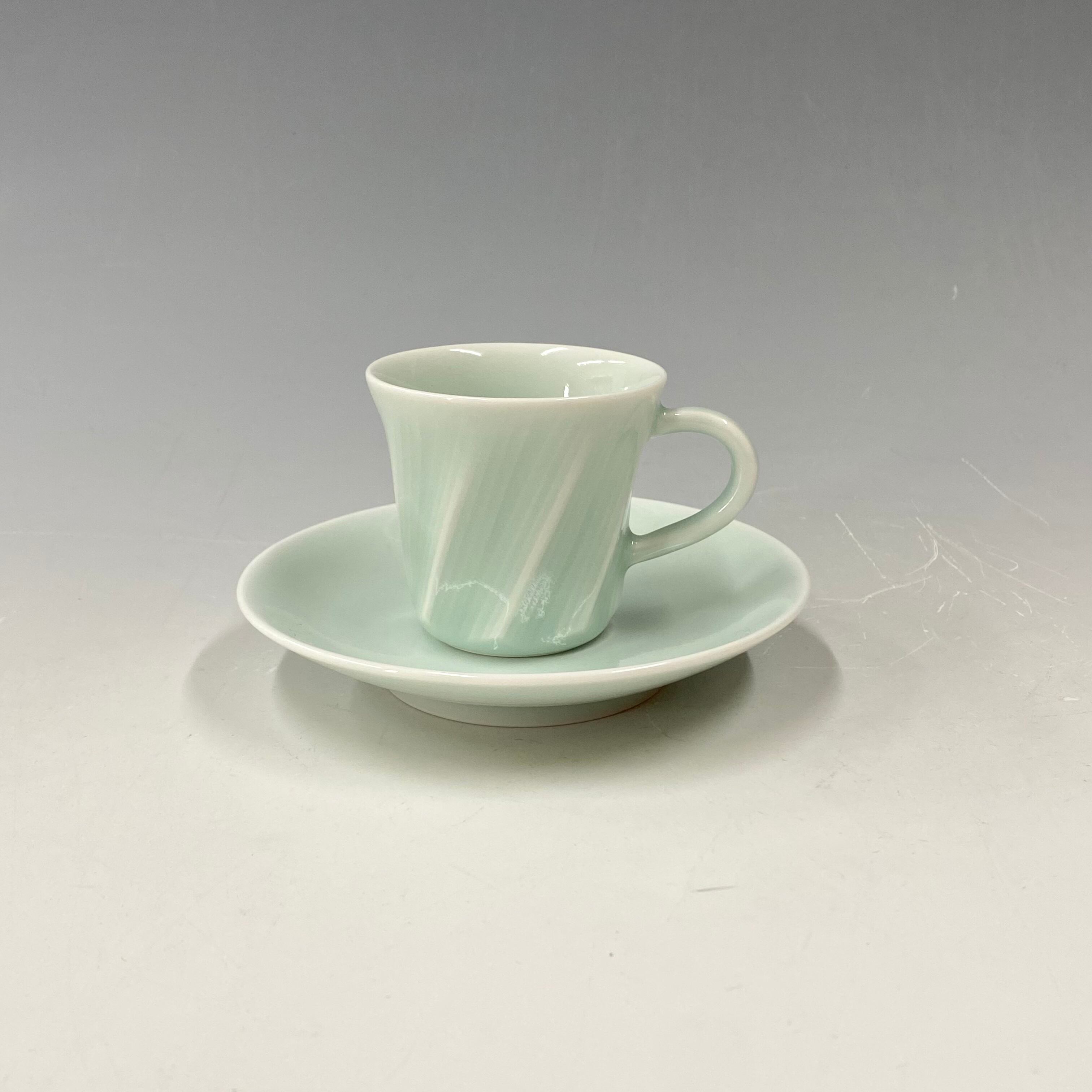ろくろで成形後、乾燥後、面を削り出し線彫を施しました。彫りの部分に青白磁釉が溜まり、陰影がとても美しいエスプレッソ碗皿です。