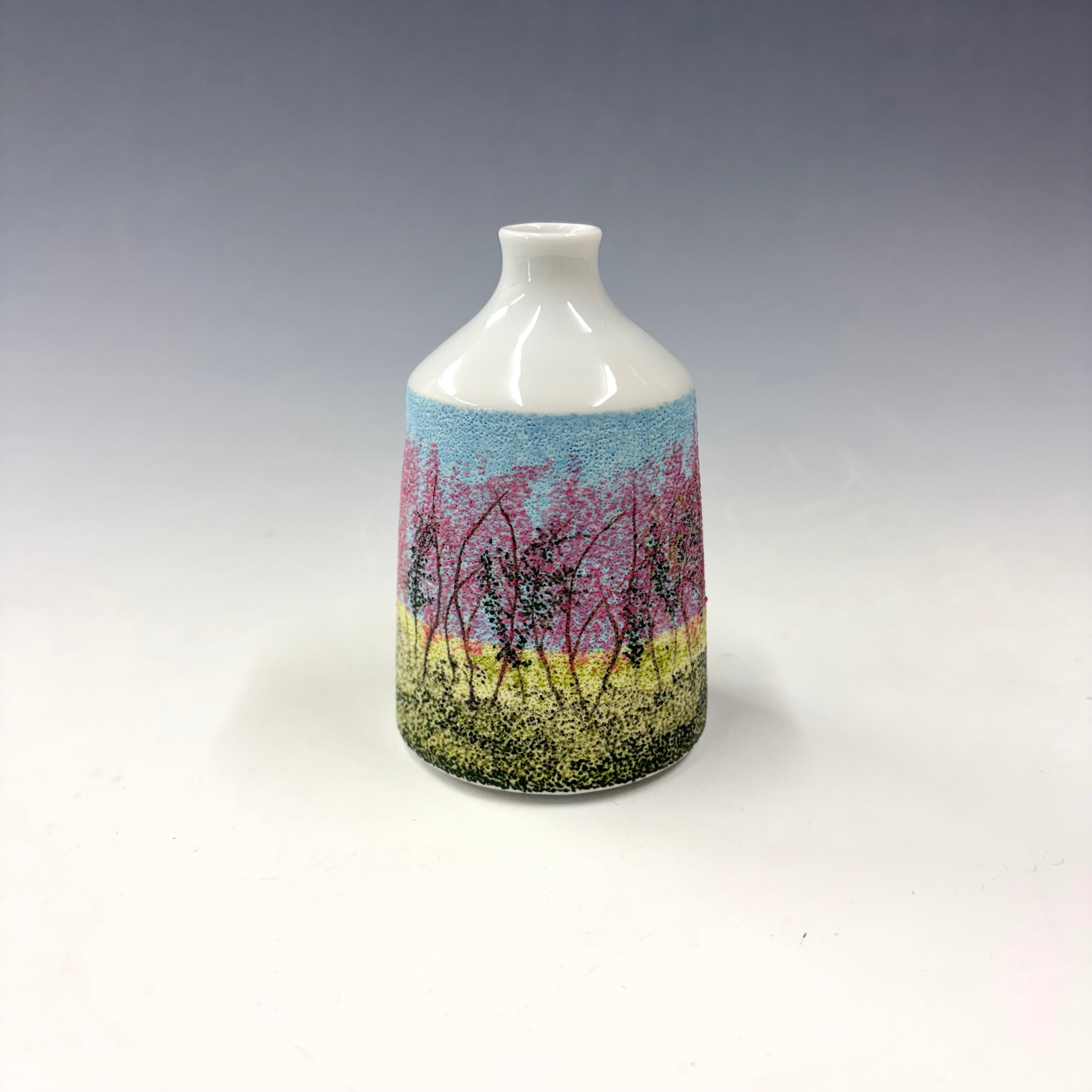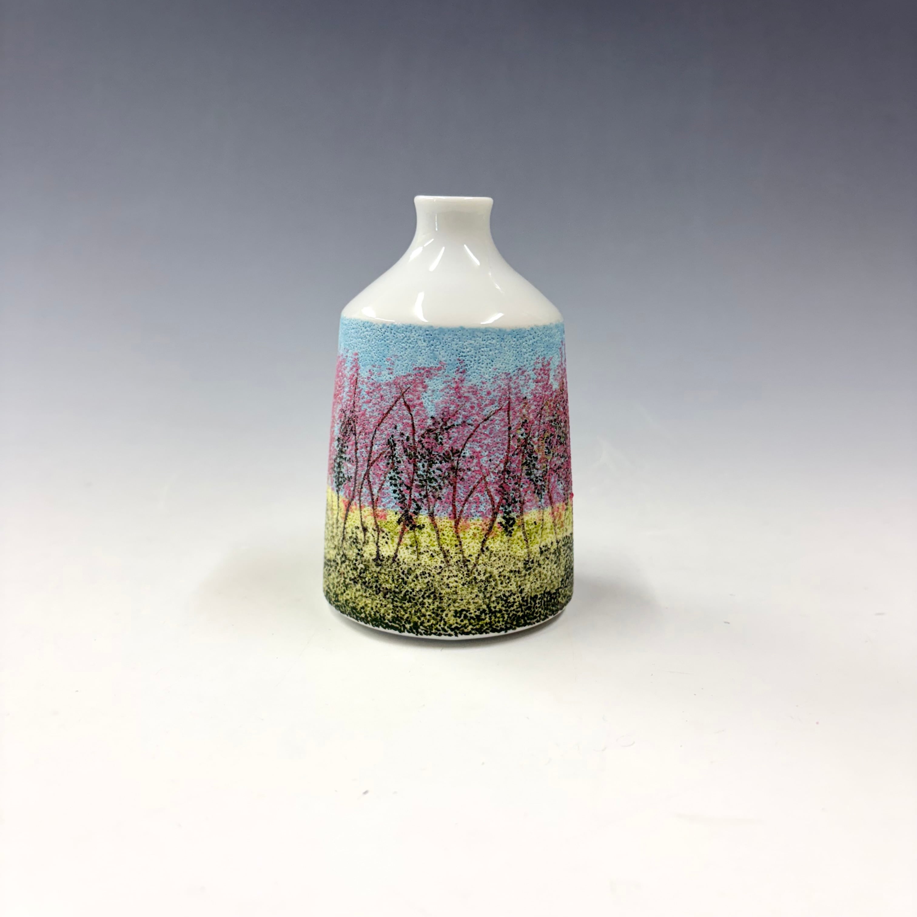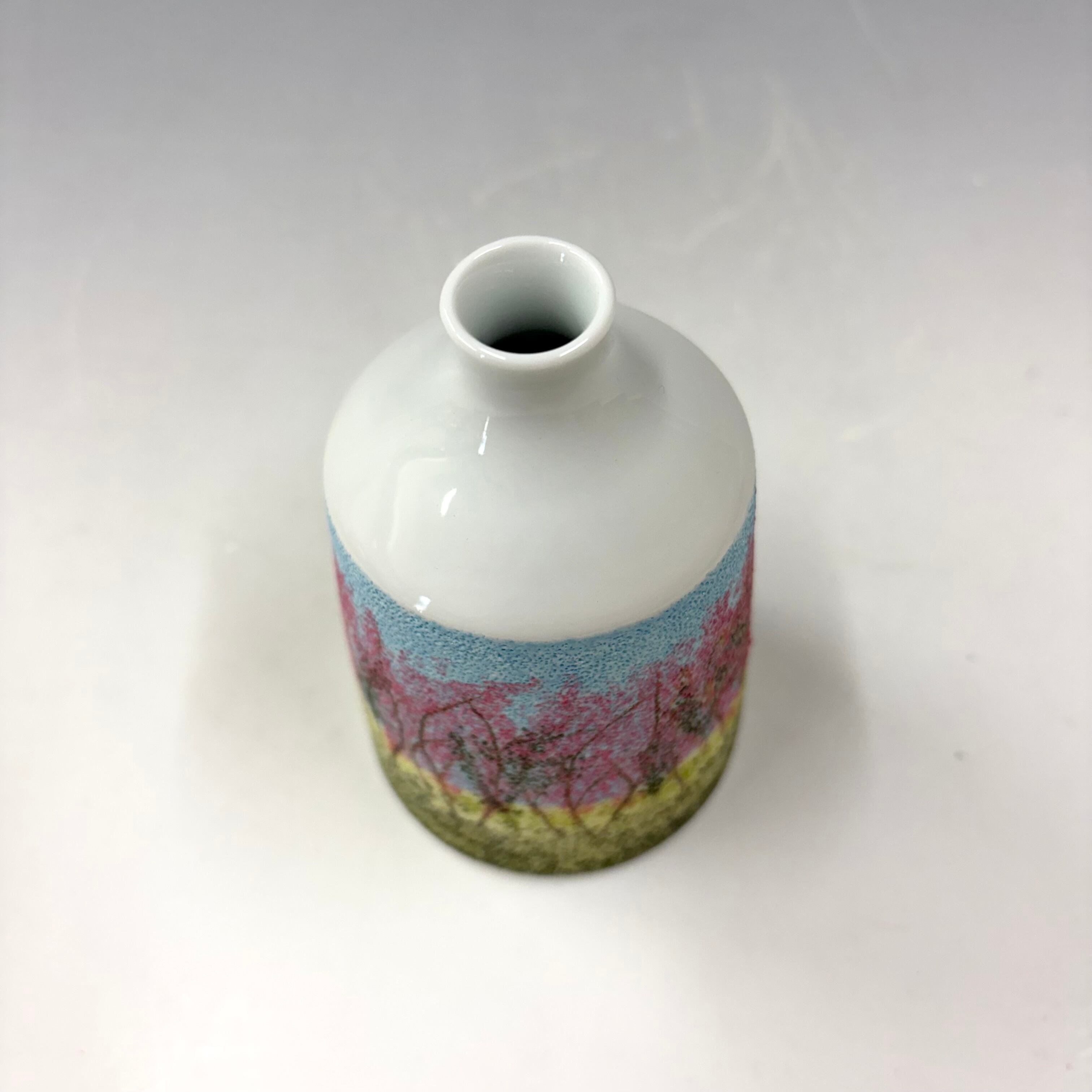 ろくろ成形後、磁肌がまだ柔らかいうちに、木綿針を使って表面に点刻を施し、顔料を刷り込んだ、他にはない一点物のミニ花瓶です。小さな花瓶ですので、小さなお花も生けやすく、点刻象嵌の景色がお花にアクセントをつけ、存在感が増します。