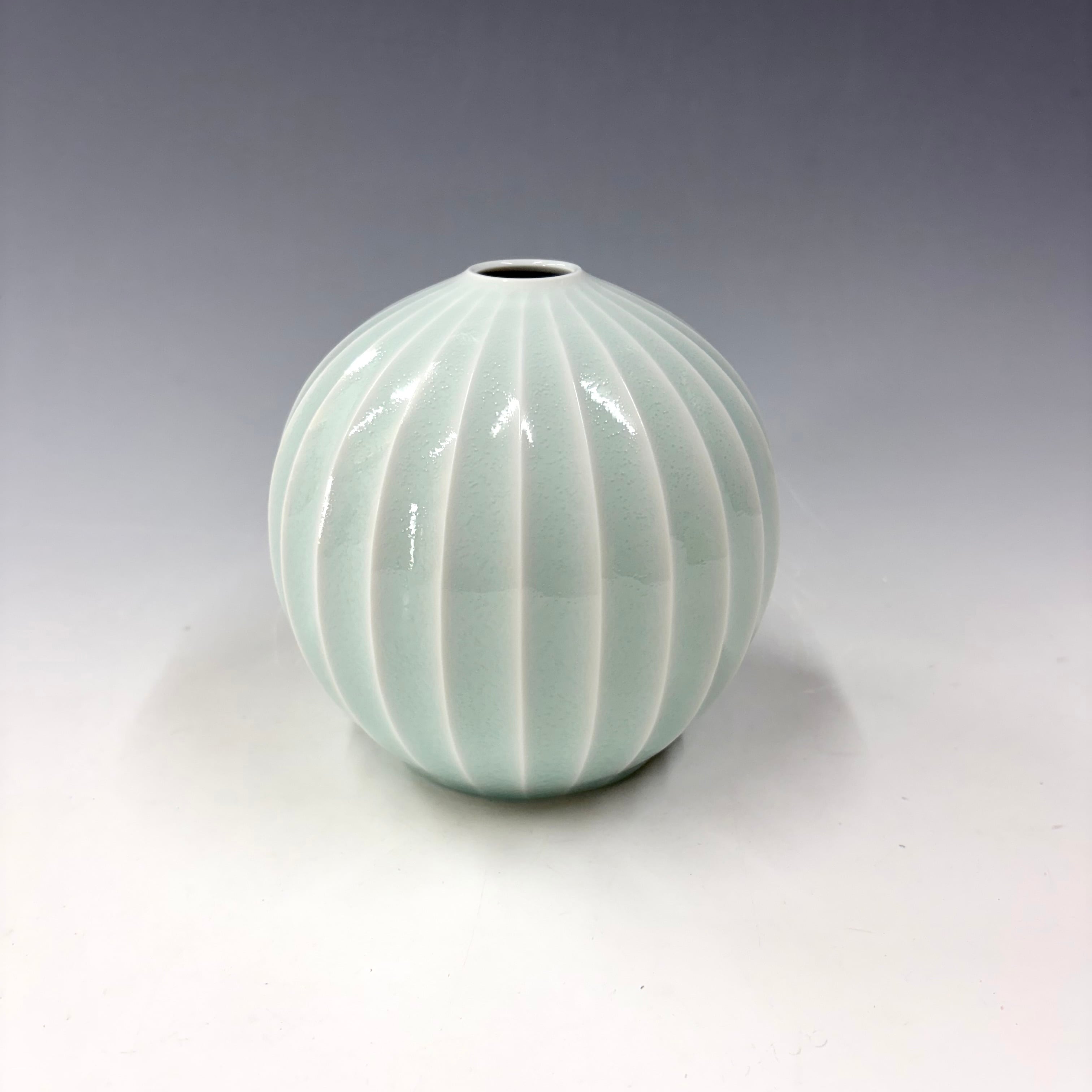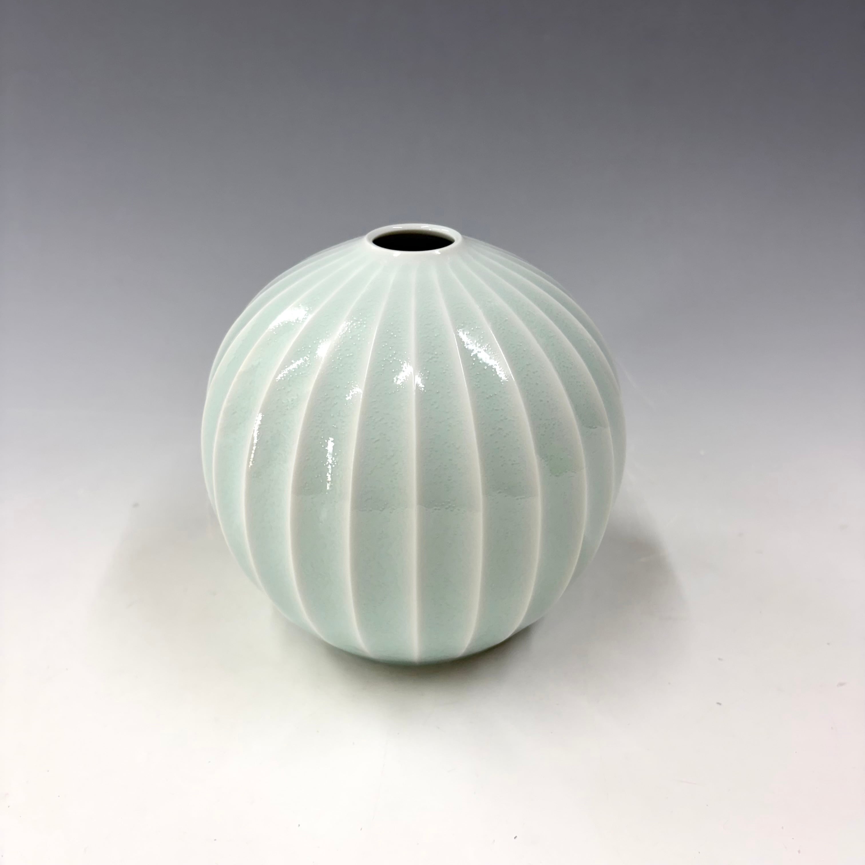 青白磁釉が流れて溜まり、青白磁釉の陰影がとても美しい壺です。