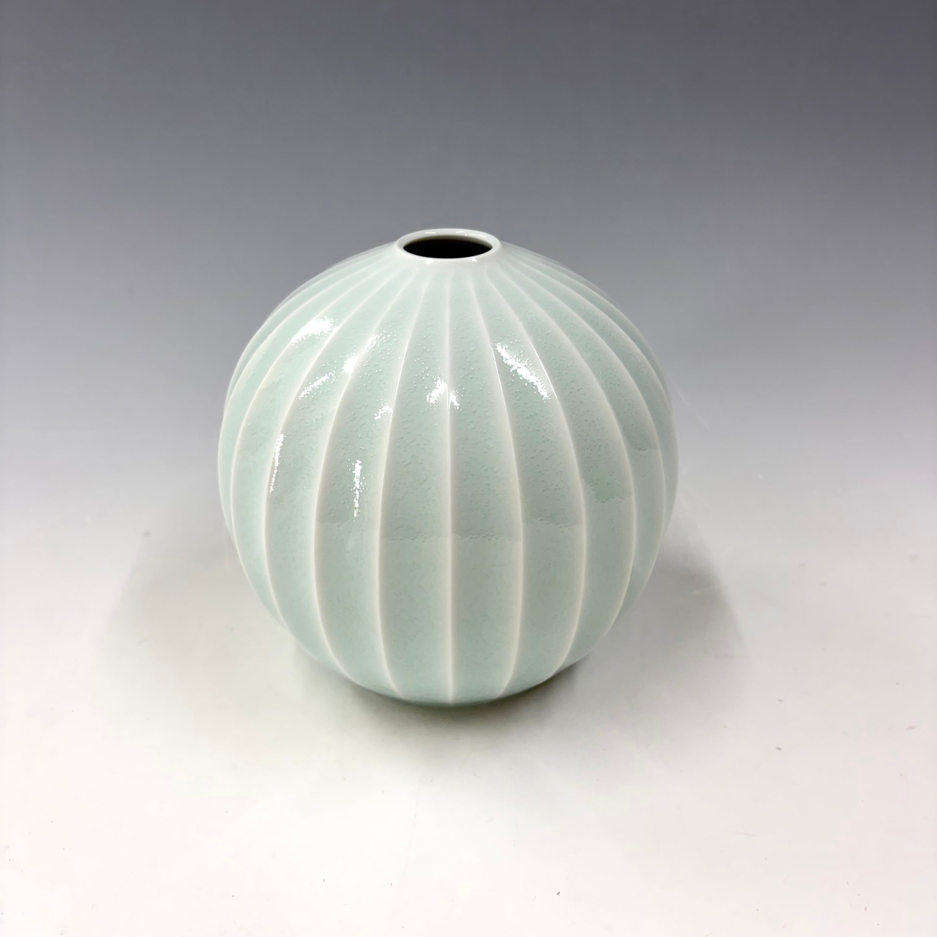ろくろ成形後、線の周りを彫り込むことにより、繊細な稜線を削り出しました。